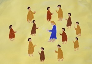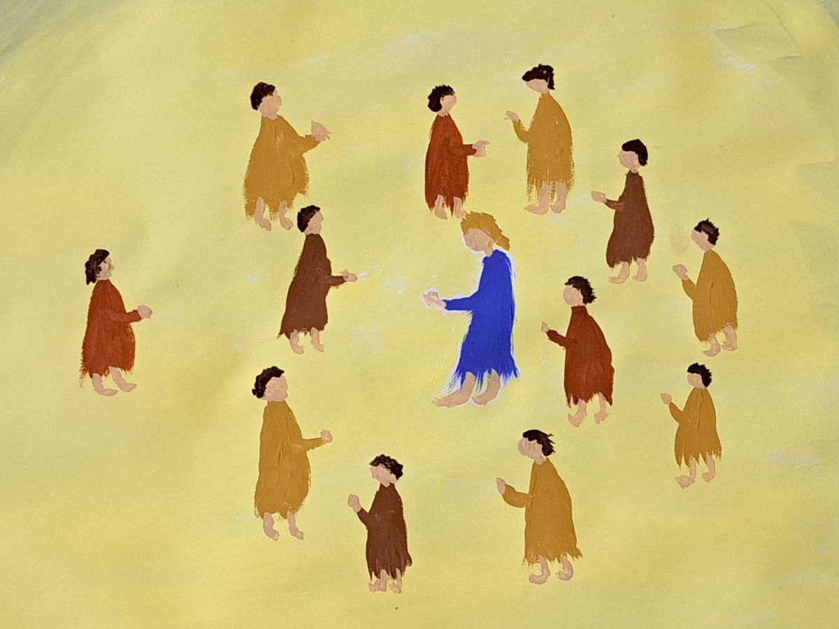 Mich hat die Stelle angesprochen, wo beschrieben ist, wie Jesus im Tempel unter den Gelehrten war. Also fing ich an zu malen. Für mich war ganz klar, dass Jesus der Kleinste auf dem Bild sein wird, da er ja noch ein Junge war. Aber wie das eben bei dieser Art von Malen manchmal passiert; ich konnte ihn einfach nicht kleiner als die anderen zeichnen. Nein im Gegenteil; er wurde der Grösste. Und das finde ich so faszinierend: Obwohl unser Verstand ganz klare Vorstellungen hat, so leitet uns unser Unterbewusstsein manchmal in eine andere Richtung. Wenn ich jeweils am Schluss meine Bilder betrachte, finde ich immer etwas, was mir das Bild sagen möchte.